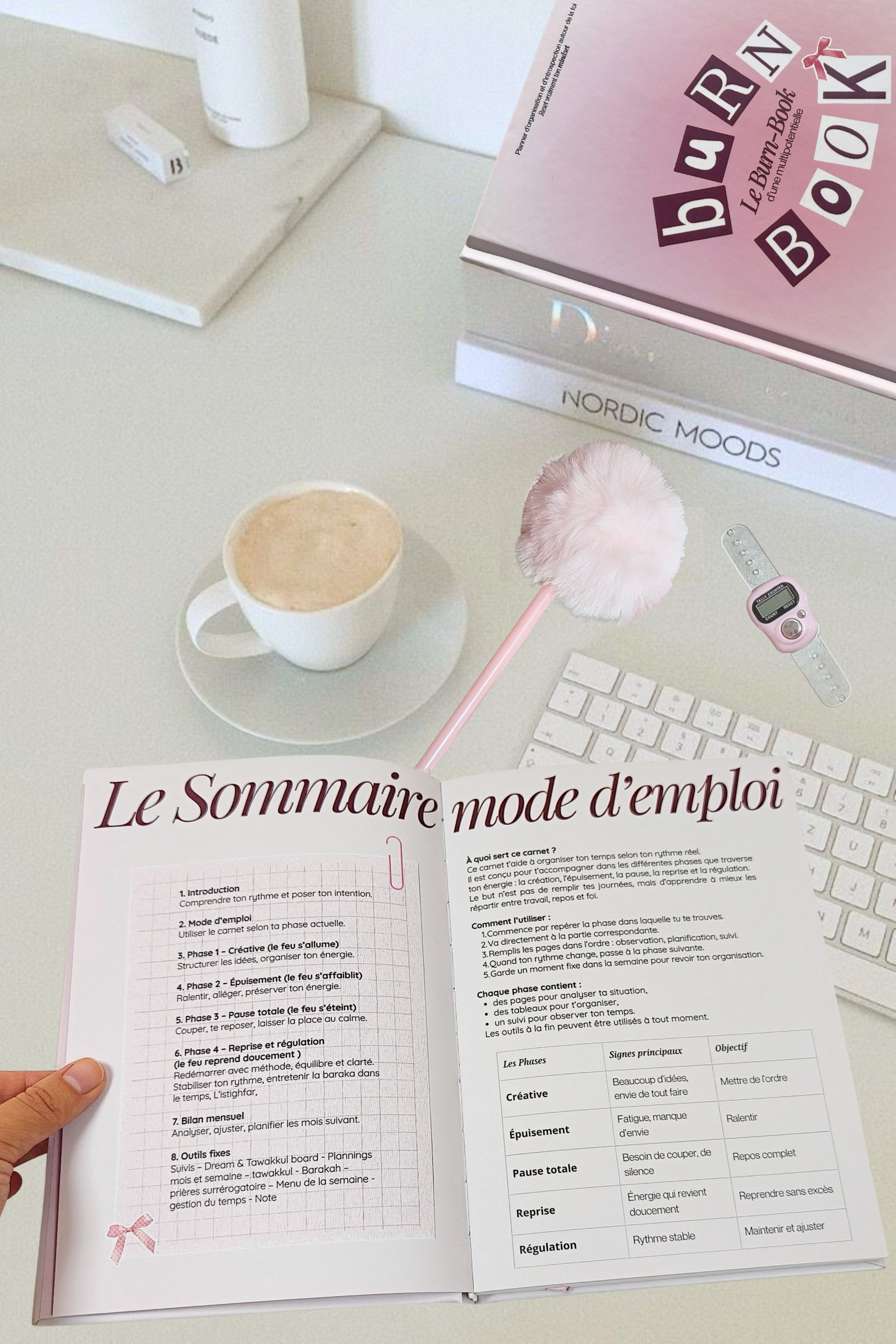 Trop souvent, les femmes créatives s’investissent intensément dans leurs projets, jusqu’à s’oublier, s’épuiser ou se couper de l’essentiel. Le Burn Book a été conçu pour proposer une autre manière de s’organiser : plus consciente, plus respectueuse de son rythme intérieur et de sa relation à Allah.